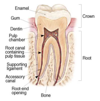 In order to understand endodontic treatment, it helps to know something about the anatomy of a tooth. Teeth have several layers. The outside layer of the tooth is composed of a hard layer called enamel. Enamel is supported by an inner layer called dentin, which has at its center a soft tissue known as the pulp. The pulp contains blood vessels, nerves, and connective tissue that are responsible for forming the surrounding dentin and enamel during tooth development. The pulp receives its nourishment supply from vessels which enter the end of the root. Although the pulp is important during development of the tooth, it is not necessary for function of the tooth. The tooth continues to be nourished by the tissues surrounding it even after the pulp is removed.